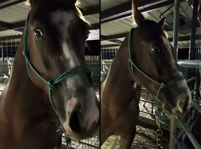 画面上には「うちの馬が初めてシマウマに会ったとき」とテキストが表示されており、馬は目を見開いて固まってしまったのだ。