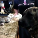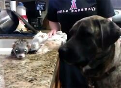 台所の流しに潜む2匹のフェレット。その様子を伺う犬。フェレットは潜みながらも犬さんにはペロペロと舐めて欲しい願望がいったりきたり繰り返しみたいだったんだ。