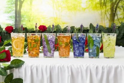 ポムフィオーレ寮をイメージした、ドライフラワーを浮かべたバタフライピーティー。