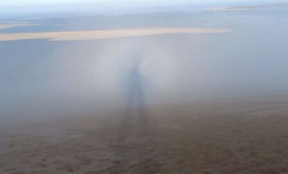 「霧の層に落ちた影がありえないほど広がって円形の虹に囲まれていたんだ。飛行機のパイロットならおなじみかもしれないね」