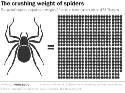 クモはほとんどの昆虫を食べる。大型の種ならトカゲや鳥、小型哺乳類まで食べる。その膨大な量と旺盛な食欲をかんがみて、世界中のクモが1年で食べれる量はどれほどだろうかと考えた者たちがいた。
