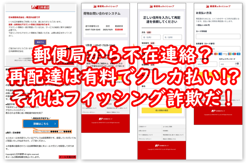 これは、「アカウント情報に問題がある」「重要書類を配達したが不在のため保管している。再配達の手配が必要」などのメールを送り付けて偽の配達先住所登録ページに誘導し、クレジットカード情報を含む個人情報を入力させてそのまま盗み取るというもの。