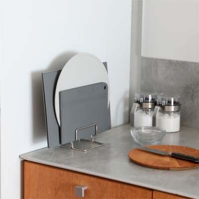 正方形・長方形・丸型など、あらゆる形のまな板を立てて収納できるスタンドで、キッチンの“置き場所問題”を解決します。