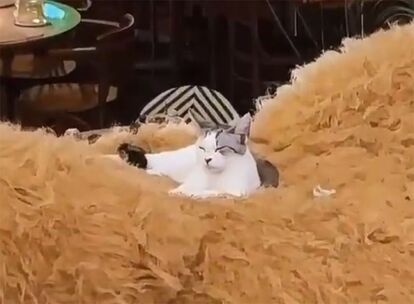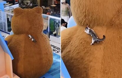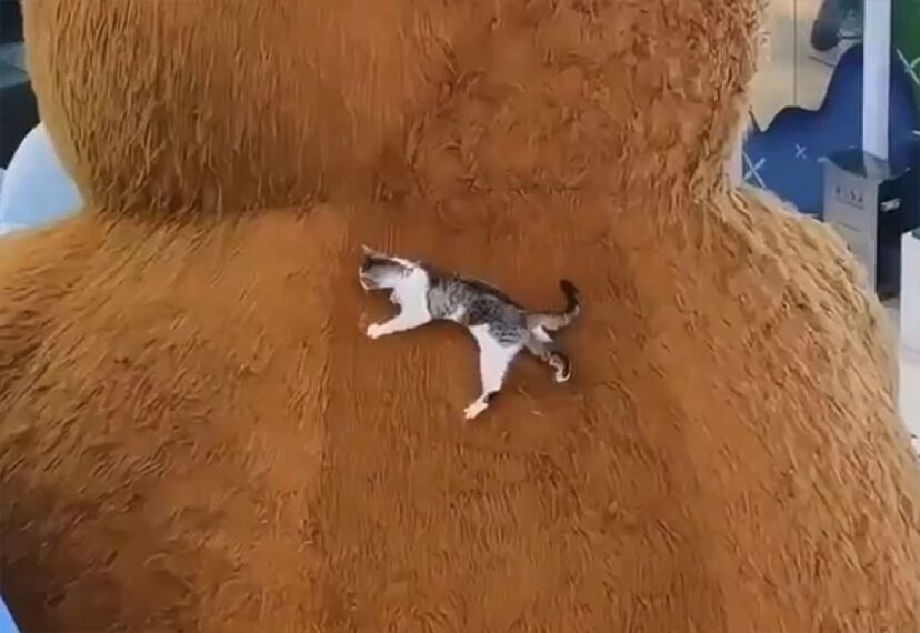 まるで哲学的な命題をつきつけちゃったっぽいタイトルにしちゃったけど、ショッピングモールに設置された巨大なぬいぐるみに登り詰めようとする猫の姿が捉えられた。