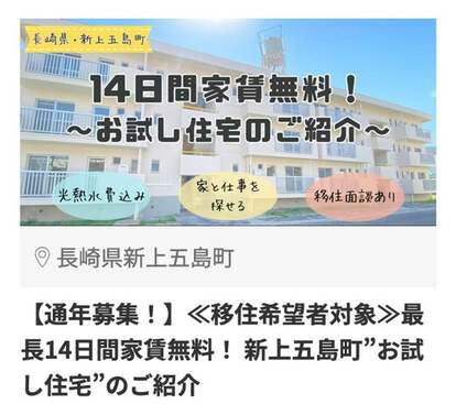・【通年募集!】≪移住希望者対象≫最長14日間家賃無料! 新上五島町”お試し【住宅”のご紹介(興味ある数:134件)
