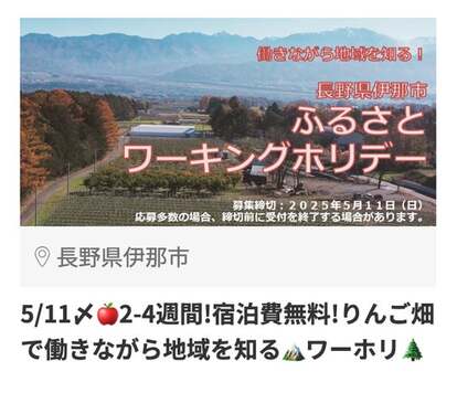 ・5/11〆 2-4週間!宿泊費無料!りんご畑で働きながら地域を知るワーホリ(興味ある数:157件)