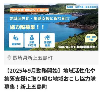 ・【2025年9月勤務開始】地域活性化や集落支援に取り組む地域おこし協力隊募集!新上五島町(興味ある数:98件)