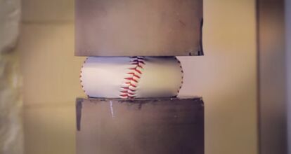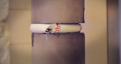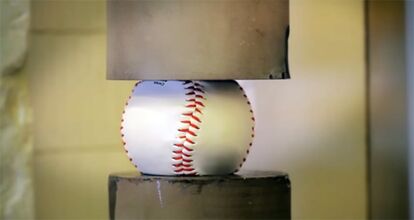 何の変哲もない野球ボール(硬球)だが、それをプレス機で押しつぶすと、何かが召喚されたというかなんというか、とにかくすごいことになる。野球ボールっていったい何でできてたんだっけ?とついググってしまったよ。