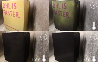 その方法はと言うと、特殊なインクを使った梱包シールを大きな段ボールに貼り付け、そのパッケージを他社の運送業者に運んでもらうというもの。このインクには仕掛けがあって、温度が上がると透明になる。透明になると、段ボールに印刷された「DHL IS FASTER(DHLはどこよりも速い)。」という赤色の大きい文字がでかでかと浮かび上がる。
