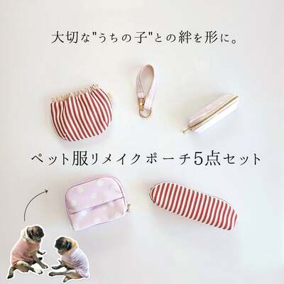 ペットの服や愛用していたブランケットを5点の布小物にリメイク。柄の特徴やシミを活かしたデザインで生まれ変わります。