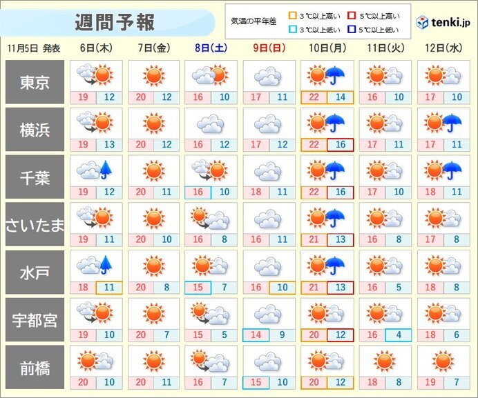 この先、関東では天気は短い周期で変わり、日々の寒暖差も大きくなりそうです。6日(木)は沿岸部を中心に雨が降るでしょう。7日(金)は立冬ですが、晴れて過ごしやすい陽気になりそうです。ただ、8日(土)と9日(日)は雲が増えて、日中もヒンヤリするでしょう。服装で上手に調節してください。