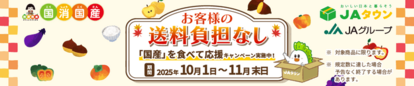 10月・11月の「JAグループ国消国産月間」にあわせ、「JAタウン」では“継続的に国産農畜産物を購入してもらうきっかけをつくる”ことを目的に、対象商品を「お客様送料負担なし」で購入できるキャンペーンを実施します。