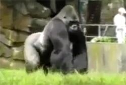 動物園にいるゴリラ。来場者に手作りの爆弾とも言うべき糞を、思いっきり投げている。前回これをやって好評だったことがわかってしまったのか?なかなかに熱い歓迎のシャワーだ。