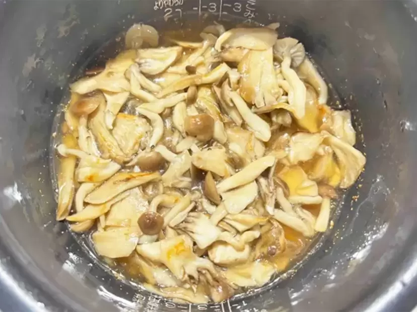 炒めたキノコをのせて、普通コースで炊飯します。