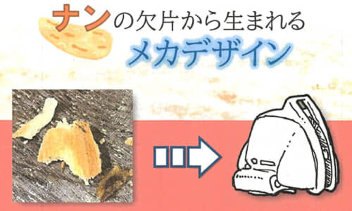 ご本には、着想のもとになったナンの写真と、そこから生まれたメカイラスト、そしてイメージの解説テキストが載っています。メカはどれもまるっこい形が採用されていて、元々はかけらだったという小ささとよくマッチして愛らしい!