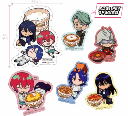 登場したオリジナルグッズには、牛丼を食べてお腹いっぱいになっていそうなマチュたちのステッカーや、コラボに合わせて製作されたビジュアルを使用したA5クリアファイルなどがあり、こちらも見逃せない。なお、どちらもデザインは選べないとのことだ。