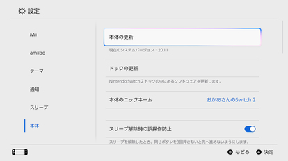なお、Nintendo Switch 2本体をインターネットに接続した状態であれば、HOMEメニューの「設定」から「本体」、「本体の更新」を選ぶことで手動での更新も可能となっている。