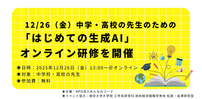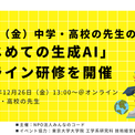 特定非営利活動法人みんなのコード(神奈川県横浜市、代表理事:杉之原 明子、以下みんなのコード)は、12月26日(金)に中学・高等学校の先生方を対象とした「はじめての生成AI」オンライン研修を開催します。