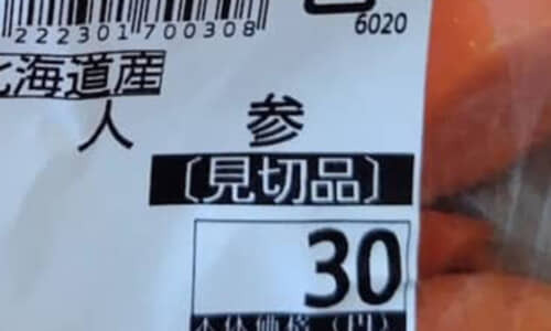 写真に写っているのは、「見切品30円(税込32.40円)」のラベルが貼られた袋詰めの人参。形をよく見ると、中央が花型にくり抜かれていたり、細くて使いにくい下の部分だったりと、どうやら“お鍋セット用などに使われた残り”のようです。