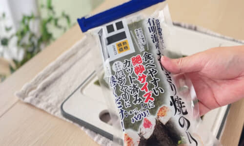 今回は、ドン・キホーテでお手頃価格の「おにぎり焼きのり(3切35枚)」を見つけたので、子どもでも食べやすいサイズの“小さめおにぎらず”を作っていきます。