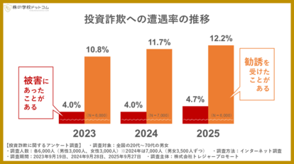 オンライン株式スクール「株の学校ドットコム」(運営会社:株式会社トレジャープロモート、東京都千代田区、代表取締役社長:瀬川 丈)では、例年、投資詐欺被害の実態調査を行っています。それによると、実際に投資詐欺の被害にあったことがあると回答した人は4.7%にのぼり、年々増加していることがわかります。