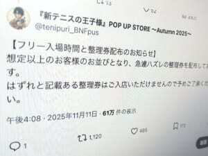 熱心なファンが多い漫画のイベントであるため、運営側は当初より混雑することを想定。イベントページには東京での開催初日11月11日に関して「混雑が予想されるため、事前抽選による入店制限を実施いたします」との案内が出ています。また、入店制限期間中の「フリー入場」については、実施の有無について公式Xを通じてアナウンスすることが告知されていました。