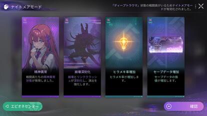 その代表が「ナイトメアモード」という高難度コンテンツ。 強いデッキを作りやすい代わりに、「戦闘マスに進まないとストレスが増える」「戦闘終了時にHPが開始時より下回ってるとストレスが増える」など追加条件があり、精神崩壊のリスクが格段に上がる。
