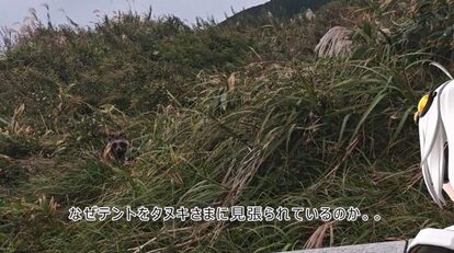 すると何者かの鳴き声が聞こえてきて外に出てみると、テントがタヌキに見張られていました。「テント」の文字の上あたりにいます。