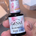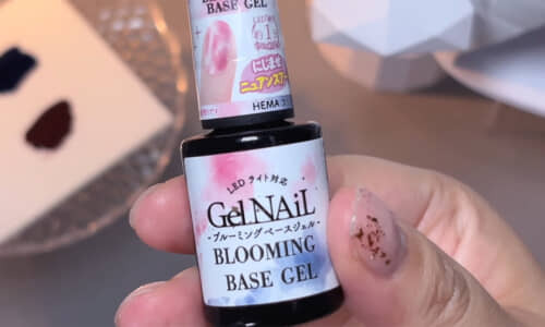 次に、今回の最重要アイテムであるセリアの「ブルーミングベースジェル」を薄く塗ります。これを塗ることで、上にのせたカラーがいい感じににじむそうです。