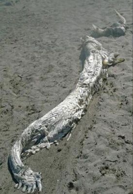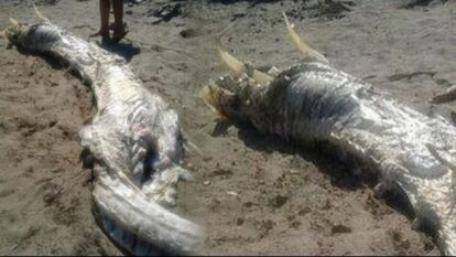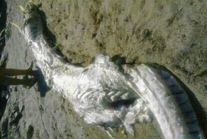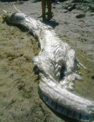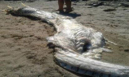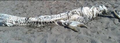 スペイン、アルメリア、ビジャリコス近くの海岸で今週初め、全長約4メートルほどの謎の巨大生物の死骸が打ち上げられたとして話題を呼んでいる。胴体は長く、頭部に角のようなものがある。