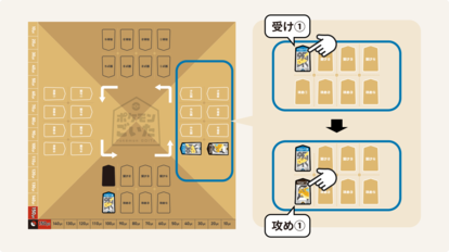 親から反時計まわりに、4人が順番に、【受け】と【攻め】を繰り返し、相手と同じコマで【受け】、好きなコマで【攻め】る。パスのときは、【なし】を宣言します。