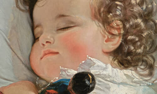 オーストリアの画家であるフリードリヒ・フォン・アマーリングが1836年に制作したこの絵は、当時のリヒテンシュタイン侯の依頼によって2歳の王女の寝顔を描いた作品。まだ小さなマリー・フランツィスカ王女は、左腕に人形を抱えてあどけない表情で眠っています。光を反射する巻き毛やピンク色のほおなど、小さな子どものかわいらしさを見事に描き出した多幸感たっぷりな絵画です。