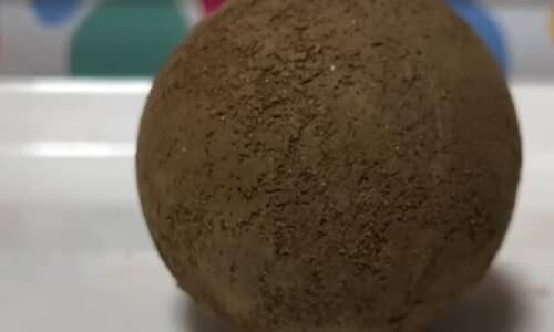 つちまるさんは最後の仕上げに、再び泥だんごを瓶の口で磨きます。塗料の筆目などが滑らかになり、表面はテカテカ。淡かった色味は深みを増し、つやめいた緑色に仕上がりました。