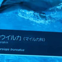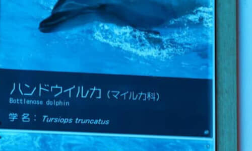 イルカの水槽の前に設置された説明パネルによると、泳いでいるイルカは「ハンドウイルカ」という種類で、学名は「Tursiops truncatus」と呼ぶようです。なかなか素人には見ただけでは種類まで分からないので、こういう説明があると助かりますよね。