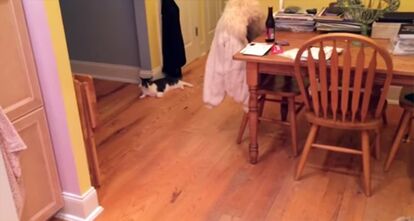 なぜこんな条件反射がついてしまったのだろう?飼い主がグラスを持ち、冷蔵庫についている自動製氷機から氷を取り出そうとすると決まって犬のソフィーが猫のネオを襲うというのだ。その現場映像がこちらである。