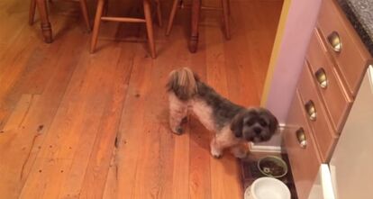 飼い主がグラスをもって冷蔵庫の自動製氷機から氷を取り出そうとすると
