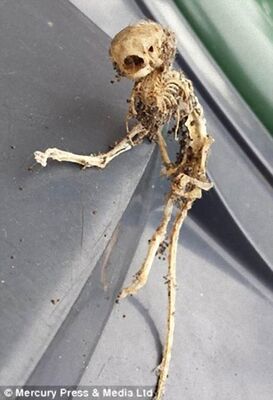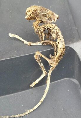 国立歴史博物館のスチュアート・ハインは、大きさからすると、この奇妙な骸骨はネズミの類で、エイリアンのように見えるのは、頭蓋骨が後ろ向きになってしまっているからではないかという。さらに前足と肩甲骨がなくなってしまっているので、よけいエイリアンのように見えるのではないかとのことだ。