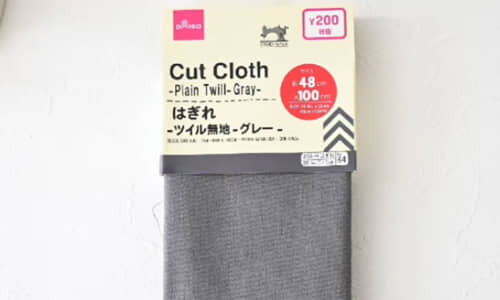 用意するのは、ダイソーのはぎれツイル生地1枚(グレー、100×48センチ)、バイアス1枚(75センチ)、タグ1枚、スナップボタン1組です。下準備としてツイル生地を本体(50センチ×31センチ)2枚、正面用1枚(上辺14センチ×底辺17センチ×高さ20センチの台形)、持ち手用2枚(35センチ×12センチ)、フリル用2枚(35センチ×5センチ)、バイアスは37センチに切り分けておきましょう。