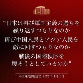 中国外交部は13日以降、赤黒い背景に白・黄色の文字で警告文を書いた画像を複数投稿。「日本は再び軍国主義の過ちを繰り返すつもりなのか」「日本が台湾海峡情勢に武力介入すれば中国は必ず正面から痛撃を加える」といったメッセージを日本語と英語で発信した。14日には、中国国防部も青地に白・黄色い文字の画像で同様の警告を投稿した。