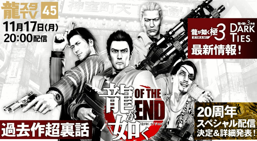 11月17日配信の「龍スタTV #45」では、『龍が如く 極3 / 龍が如く3外伝 Dark Ties』や20周年企画に関する新情報が一挙公開された。本記事では、番組内で明らかになった内容を以下にまとめている。