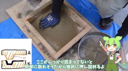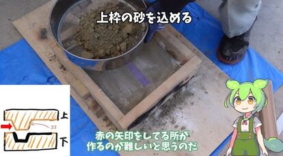 そっと戻したら注ぎ口と重しを乗せて、砂型の完成です!