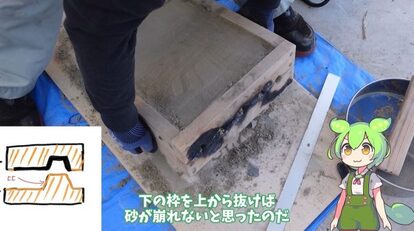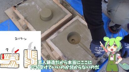 あとは溶かしたアルミが流れる道を砂を削って作ったら、砂型を立てます。縦にするほうが成功率が高いのだそうです。