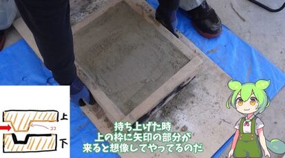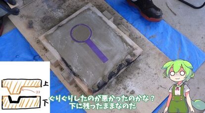 やり直して2回目の挑戦。上下を逆にして砂型を持ち上げます。