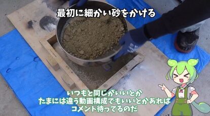 最初にふるいにかけながら細かい砂をかけたら、ざっくり砂を入れて押し固めます。
