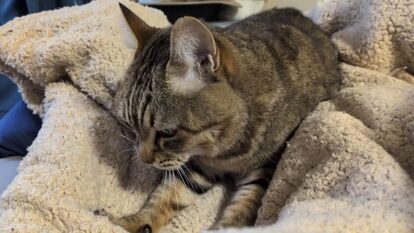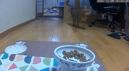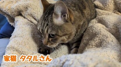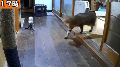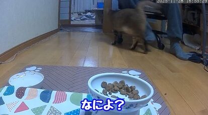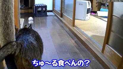 17時頃にタタルさんは帰宅。椅子に座るすずめさんのところへやって来ると、「ニャー」と何やら話しかけてきます。