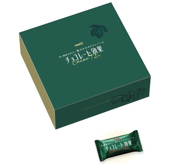 チョコレート効果72 パーセントには、1枚で127ミリグラム、5枚で635ミリグラムのカカオポリフェノールが含まれる。