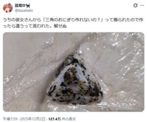笠蛇さんによれば、あまったご飯をおにぎりにして食べようとしたところ、彼女さんから「三角のおにぎり作って」のオーダーが。笠蛇さんはこれに「作れんよ」と応じつつ挑戦したところ、上述の三角錐おにぎりが生まれたとのことです。