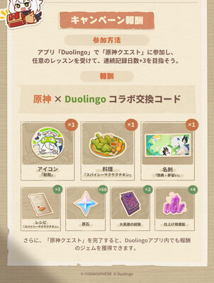 イベント開催期間は日本時間12月28日午前8時59分まで。期間中にDuolingoアプリ内で「連続記録日数+3日」を達成することで、イベント限定アイコンや料理「スパイシーサクサクチキン」、原石60個など、『原神』ゲーム内のアイテムと交換できるコードが入手可能だ。
