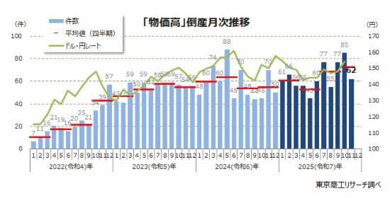 2025年11月の「物価高」倒産は、62件(前年同月比11.4%減)で、6カ月ぶりに前年同月を下回った。