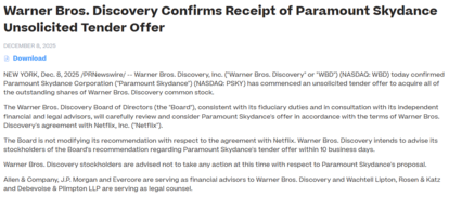ワーナー取締役会は今後10営業日以内に、パラマウント案に対する公式な見解と推奨事項を株主に通知する予定だ。